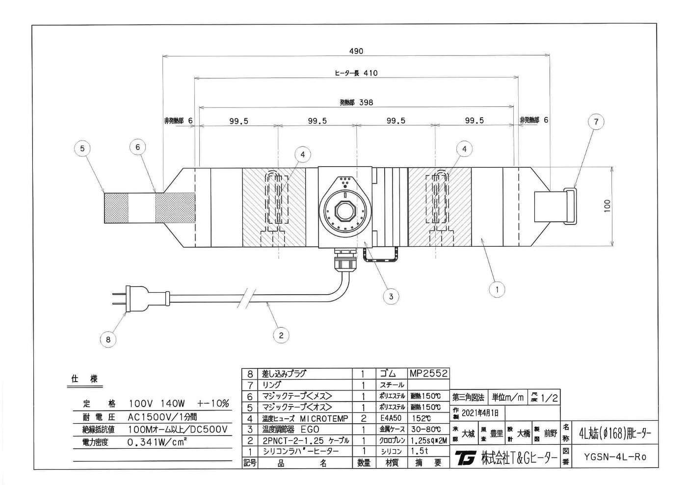 | 適合缶 | 4L丸缶 (Φ168mmx215mm) | 発熱エレメント | ニッケルクロム丸線 |